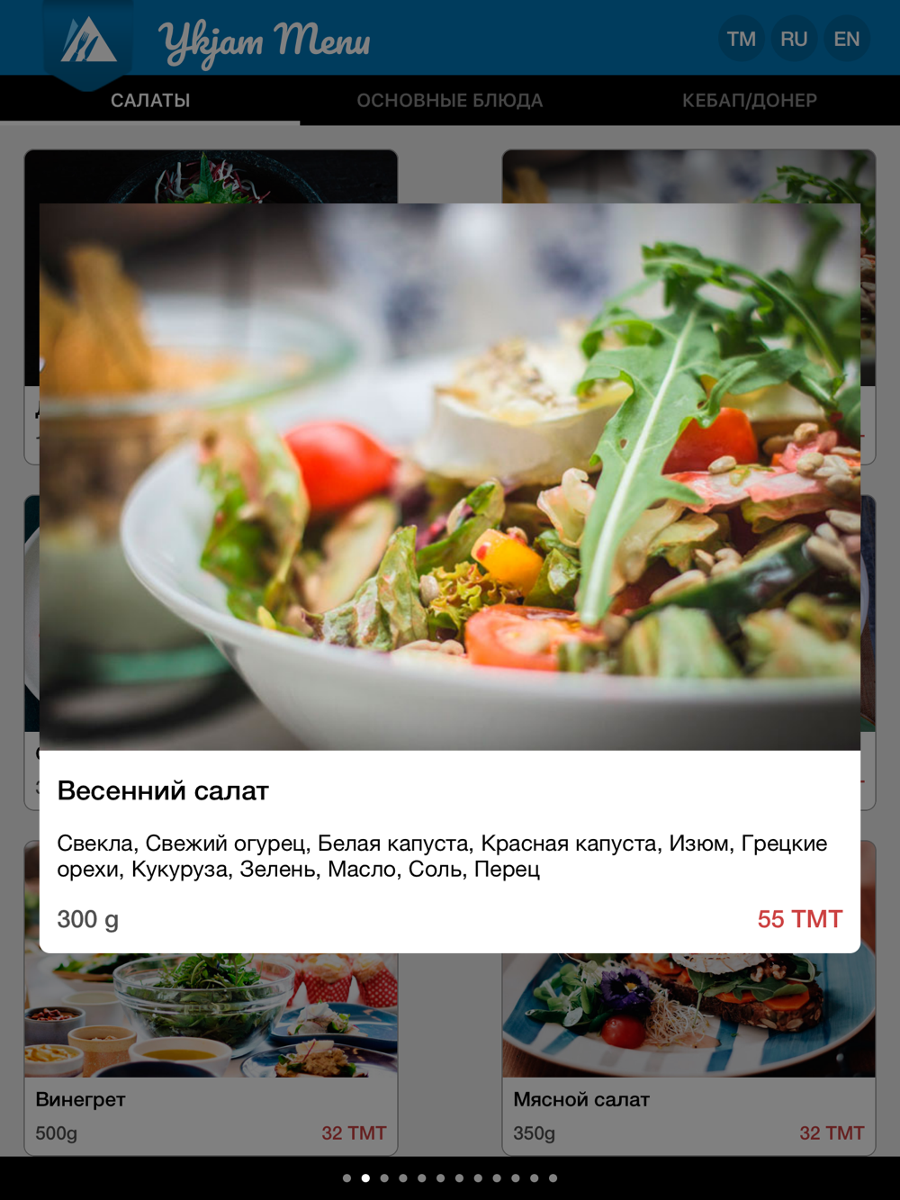 Замечание: В приложении доступен демо-режим. Для полноценной работы необходимо приобрести серверную часть приложения. Больше информации на http://menu.ykjam.tm.