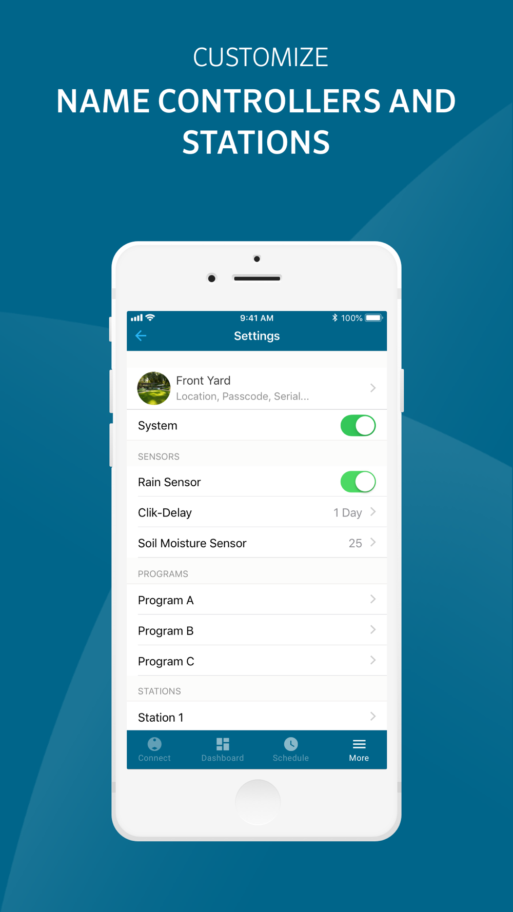 • See controller status, total watering and next start times, watering calendar, and irrigation logs