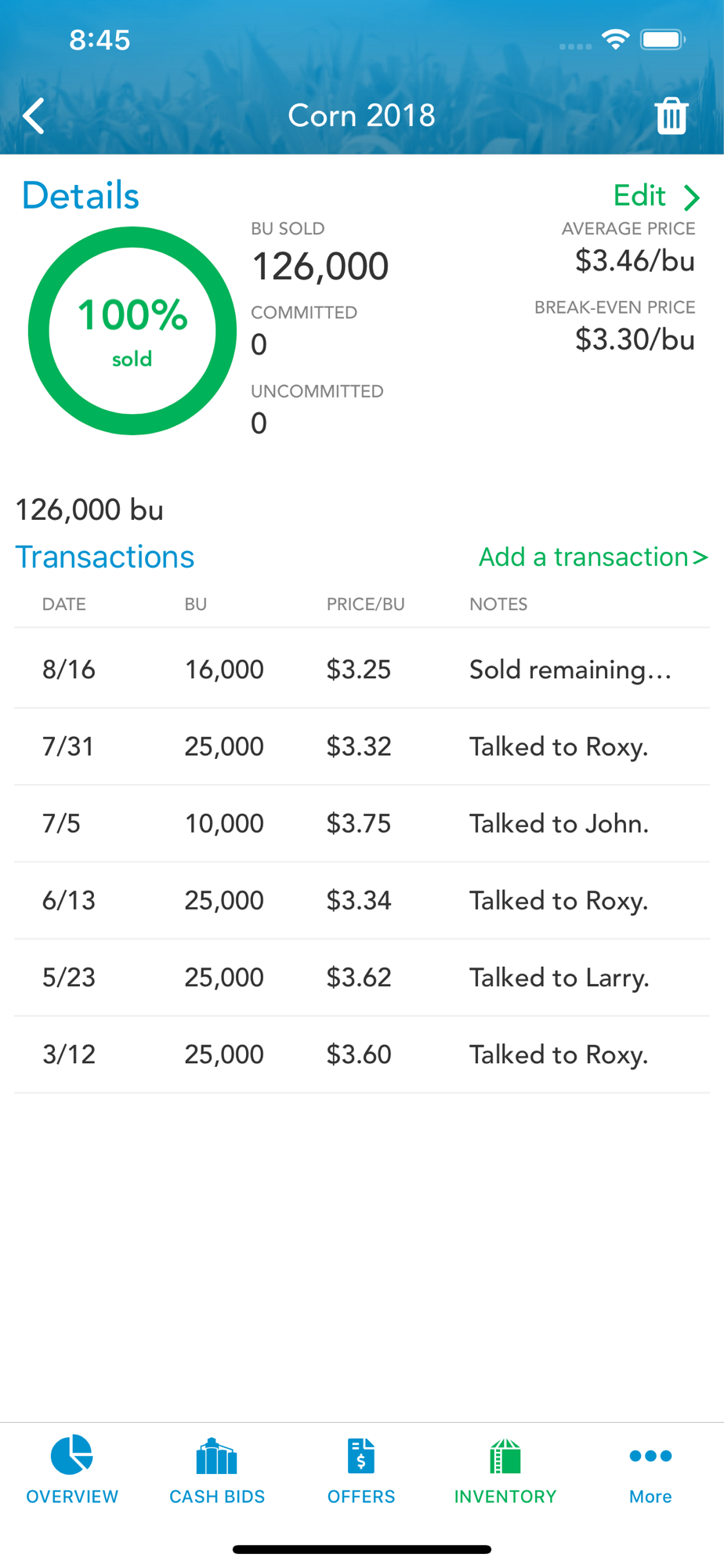 • Offers – Initiate and complete grain sales with minimal data entry and authentication hassles. Use the call capability to have your buyer enter your offer and push the transaction to the app for your confirmation.