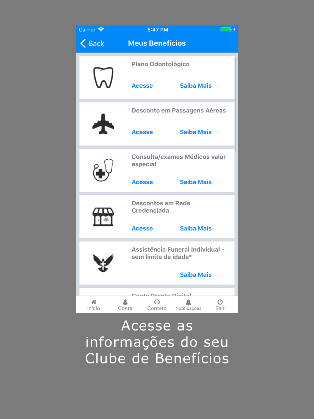 Clube de Benefícios, que visa conceder aos seus usuários acesso a promoções, descontos e vantagens diferenciados em produtos e serviços, de abrangência nacional, nos mais diversos segmentos:
