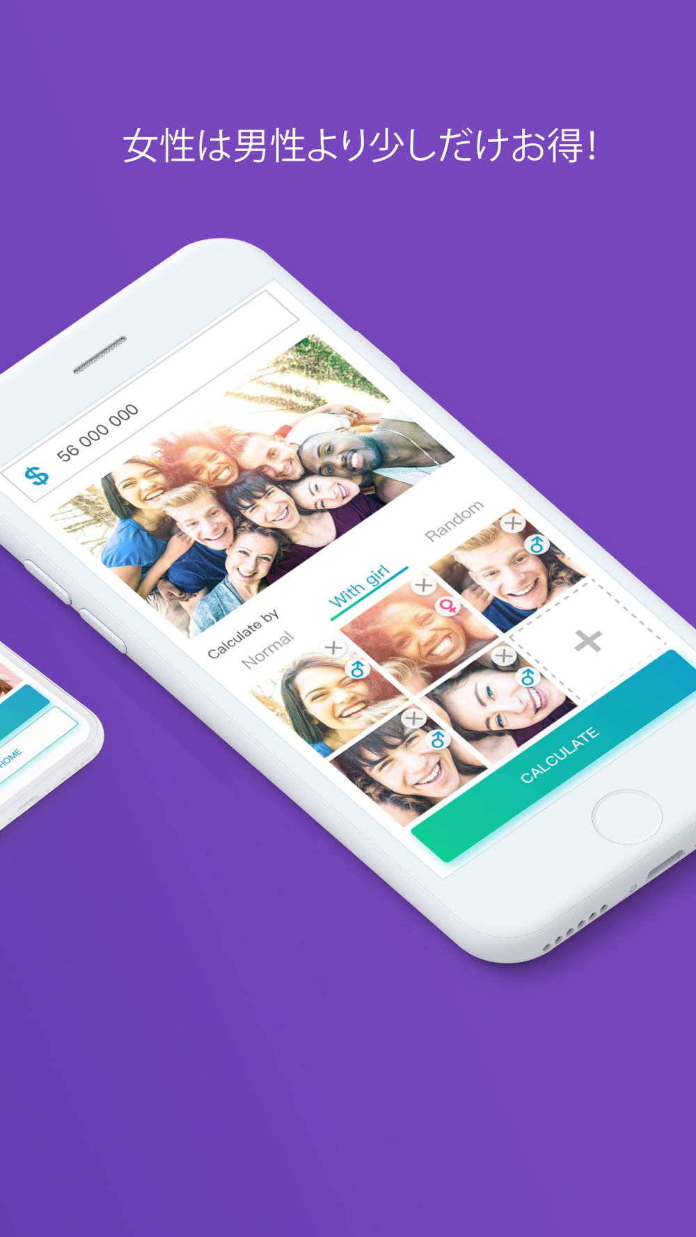 集合写真から顔認識で、参加者数を割り出し、割り勘します。また、女性は支払率を低めに設定できます。男女以外にも、上司と部下、先輩と後輩など、支払う割合に変化を持たせたい時にご利用いただけます。