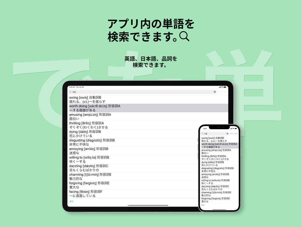 検索ページでは単語や意味、発音記号から検索することができます。検索した単語から品詞別リストへ移動できます。