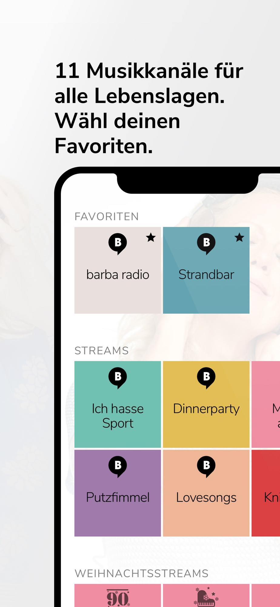 Hört zudem das Radio von Barbara Schöneberger und Musikkanäle für alle Lebenslagen. 24 Stunden Programm und zusätzlich 10 Playlisten für jede Lebenslage. Von "Dinnerparty" über "Ladies Night" bis "Sonntag Morgen" oder Barbaras relaxtem Sommerkanal "Strandbar".