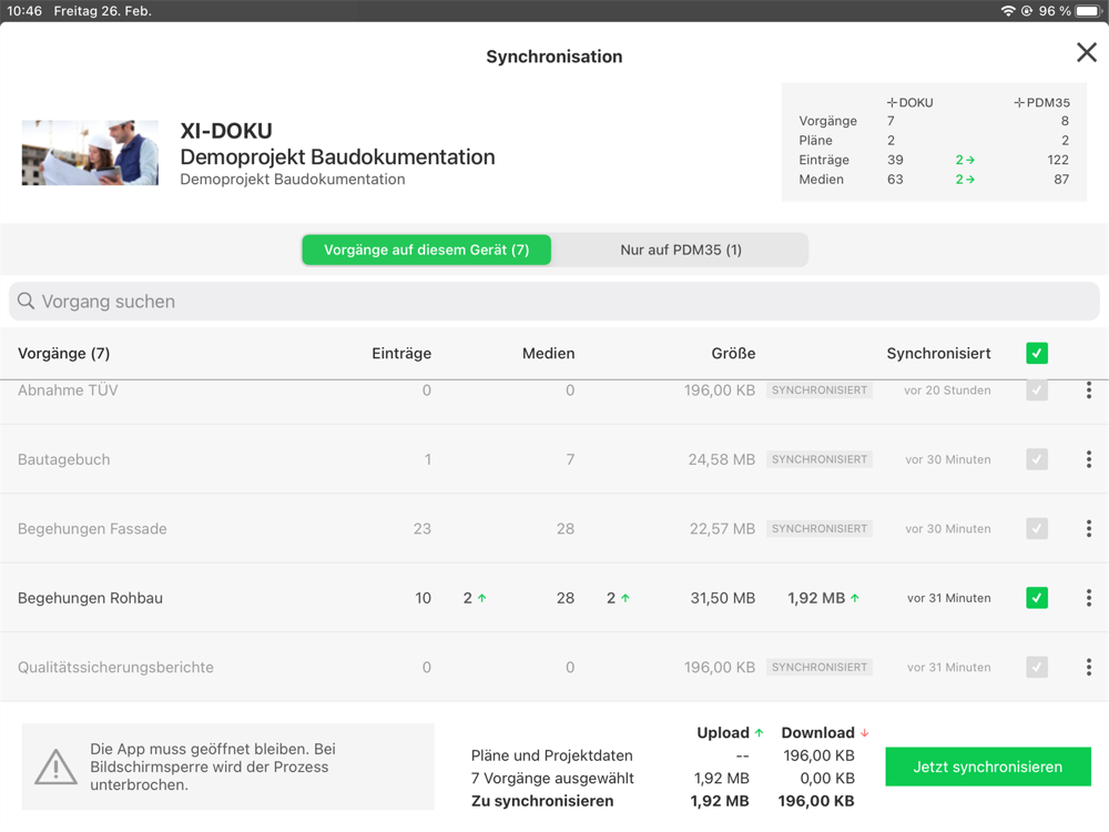 Die App vereint alle für den Dokumentationsprozess relevanten Funktionen unter einer intuitiven Nutzeroberfläche. Dank der klaren Struktur und des übersichtlichen Designs behalten Sie selbst auf Großbaustellen immer den Überblick. Durchdachte Features wie die Duplizier-Funktion gewährleisten ein ganzheitliches und flüssiges Arbeiten vor Ort in atemberaubender Verarbeitungsgeschwindigkeit. Die App +DOKU ist offlinefähig - eine Internetanbindung ist lediglich zum Synchronisieren der Daten erforderlich.