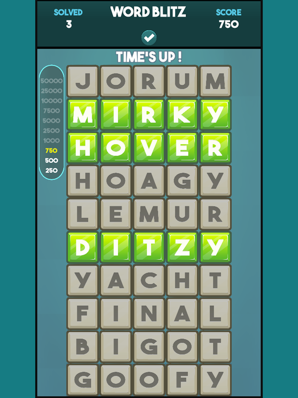 Unscramble the words as they drop into the well. Correct words will clear from the well. Use 3 special boosts to help keep well clear. Once well fills with words the game ends. As game progresses, words spawn quicker; but fear not the three special boosts are helpful to blast words from well, reveal first letter of words, and freeze spawning.