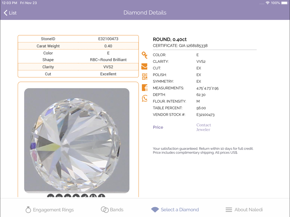 Attention Jewelry Sales Associates: Naledi Jewelry and IGC Loose Diamonds at your fingertips! This APP showcases the stunning Naledi Jewelry Collection in one location. Present stunning images and detailed information about the Naledi Collection’s gorgeous engagement rings, wedding bands, fashion jewelry and loose diamonds. Browse through the entire collection or simply search to find a specific item. Quickly view cut and carat options for each ring to create a more streamlined sales process.