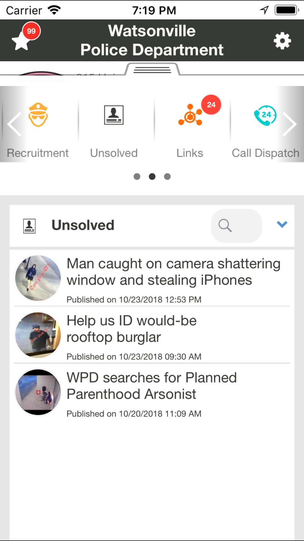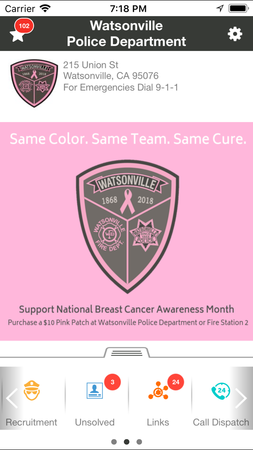 The Watsonville Police Department is committed to providing an open and two way communication link to the department. In partnership with LogicTree IT Solutions, Inc., the department now offers a mobile app that provides the perfect way for you to receive notifications of critical information immediately to your mobile device, as well as bulletins about missing persons, stolen vehicles, traffic incidents, etc. The Watsonville Police Department App allows you to easily submit tips (anonymously if desired), send comments, photos and place non-emergency calls to the department with the touch of a button.