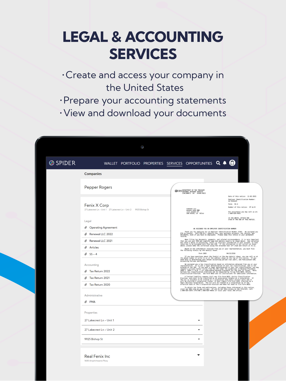 - Legal and accounting services for your tax and legal management
