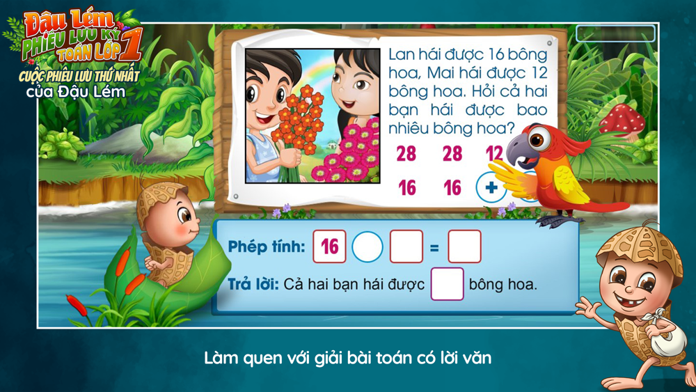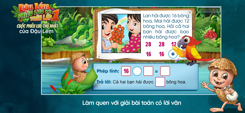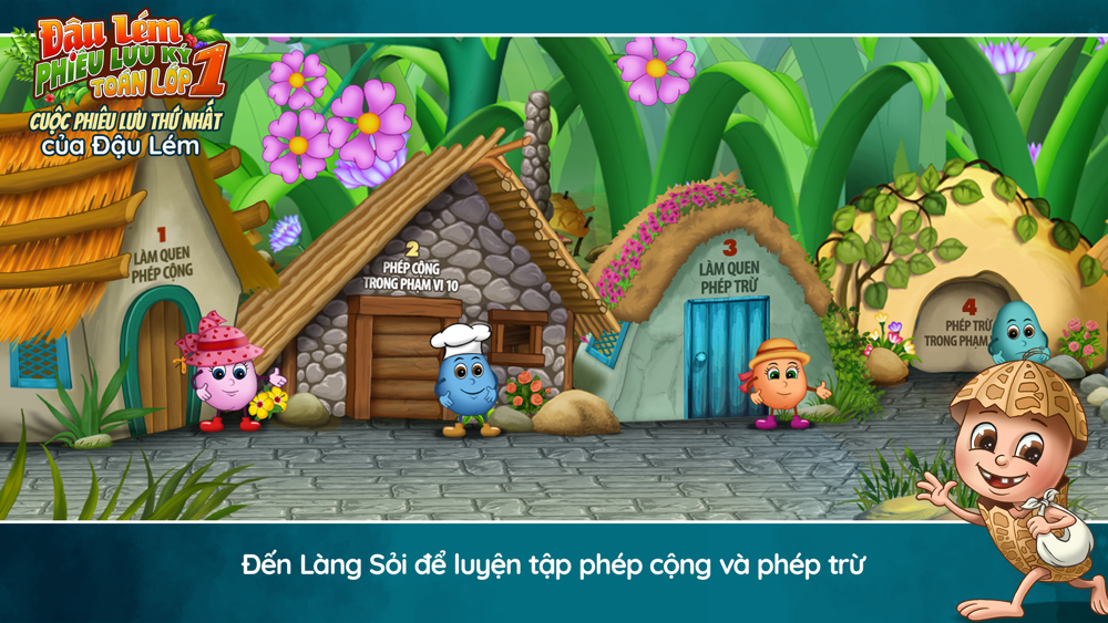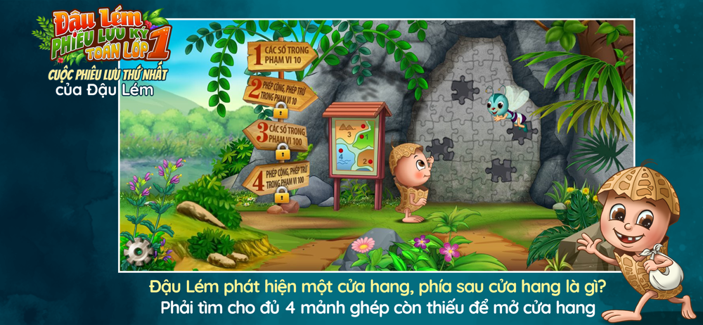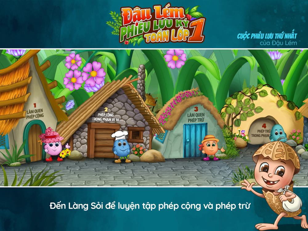 Trong chuyến phiêu lưu đầu tiên, Đậu Lém dừng chân trước một cửa hang, phải đi qua 4 con đường để tìm cho đủ 4 mảnh ghép lắp vào để mở được cửa (tương ứng 4 chương trong Toán lớp 1).