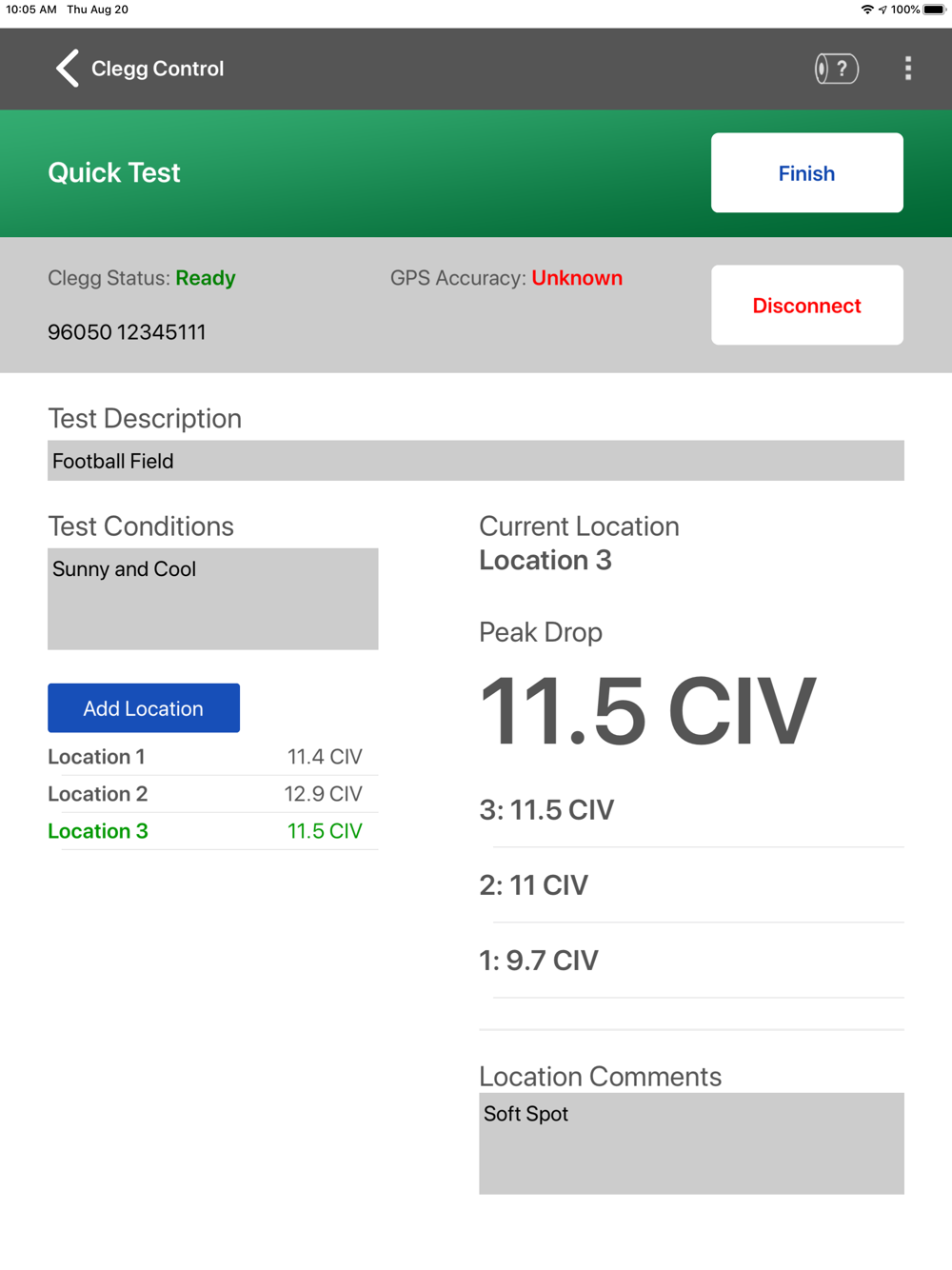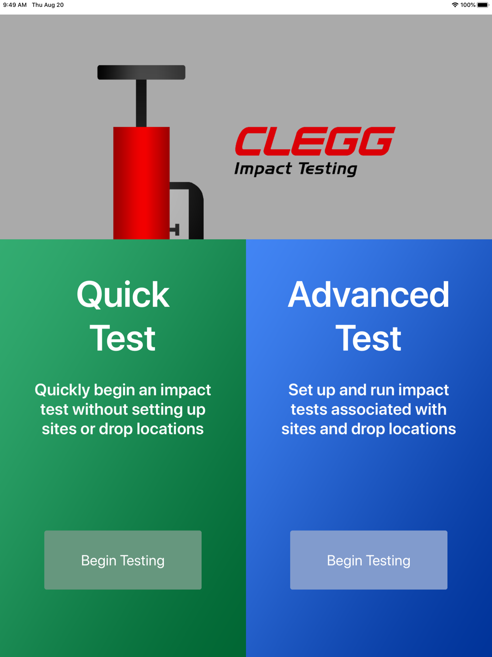 The Lafayette Instrument Clegg Control app takes the place of a physical Clegg Control handheld device. Using this app, an operator can easily set up a test site and perform a test with limited manual input. An updated Quick Testing mode now allows testing multiple locations with the convenience of GPS location mapping while Advanced Testing Mode allows operators to enter preset sites and specific test locations in order to provide a consistent and more streamlined testing experience. Acquired data can be stored and viewed by test site, date, and test session. A simple data export process allows scoring data to be exported to other programs for further interpretation and comparison.
