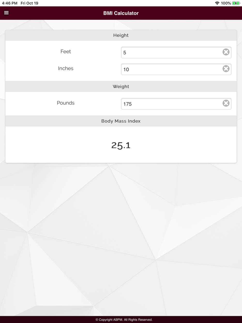 The ABPM App accompanies the website www.abpmed.org. It features information about ABPM and examinations, examination practice questions, reference ranges, biomechanical examination templates, a BMI calculator, a weight conversion calculator, and can receive optional notifications from ABPM regarding news and events.