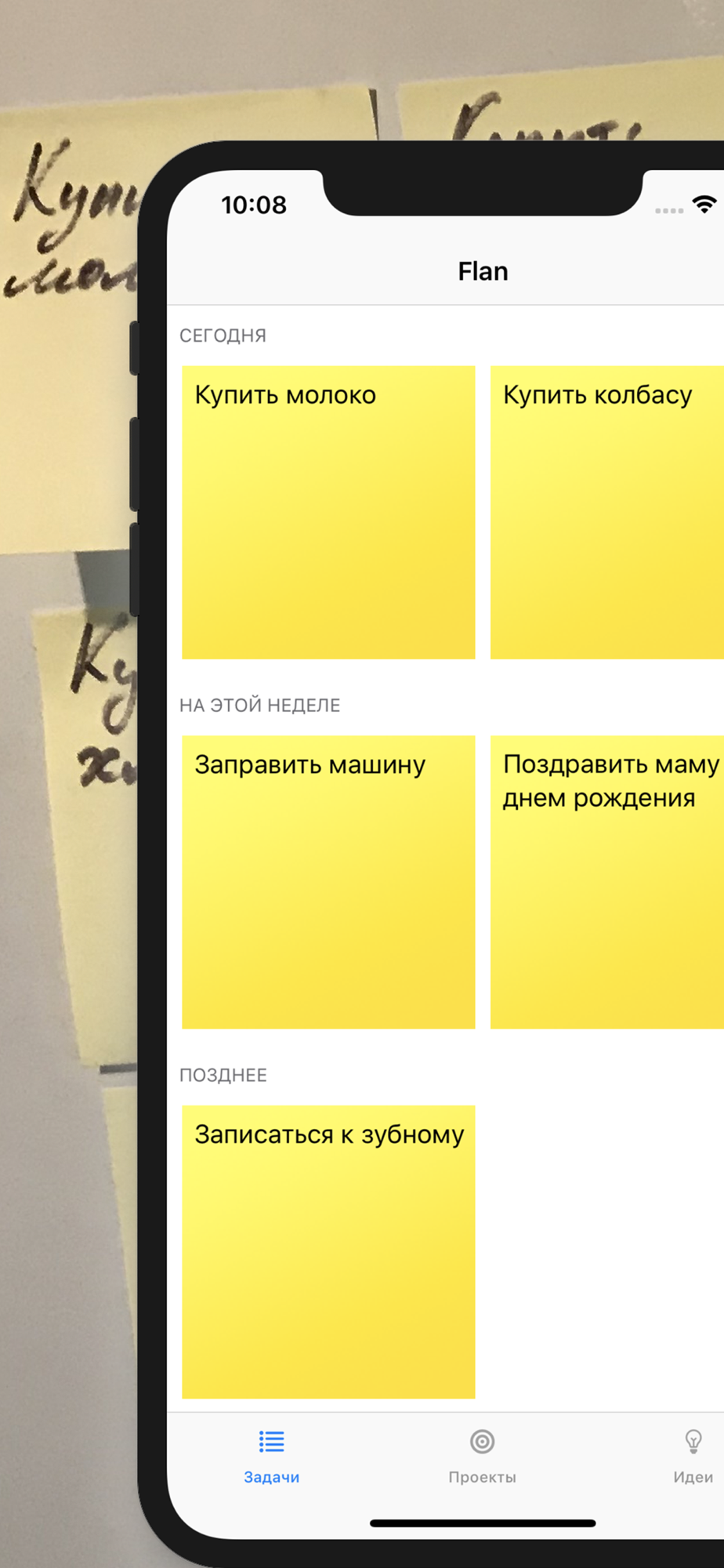 Приложение Flan поможет организовать список ваших дел на сегодня, на эту неделю и на последующее время в простом и понятном виде желтых листочков.