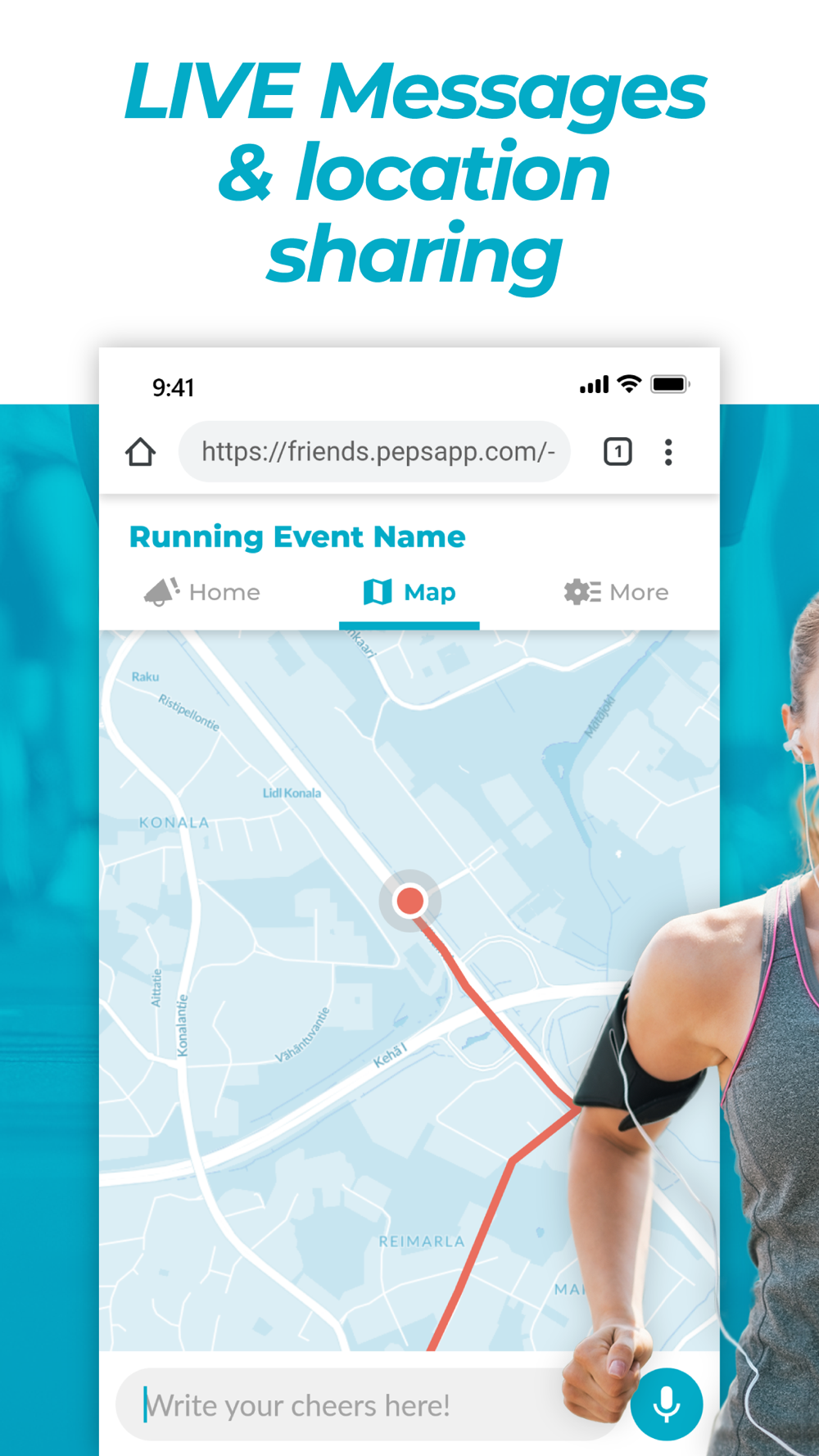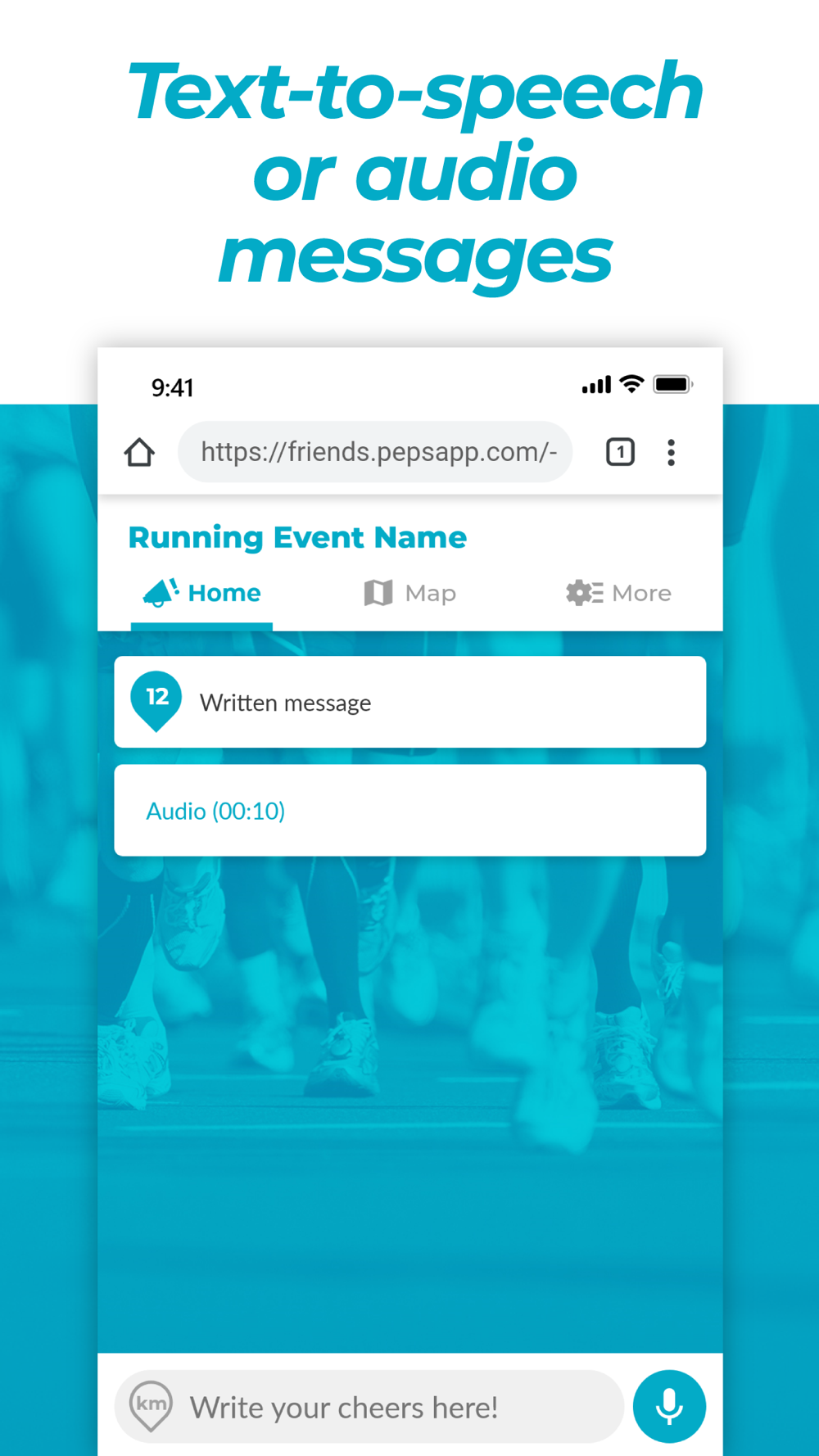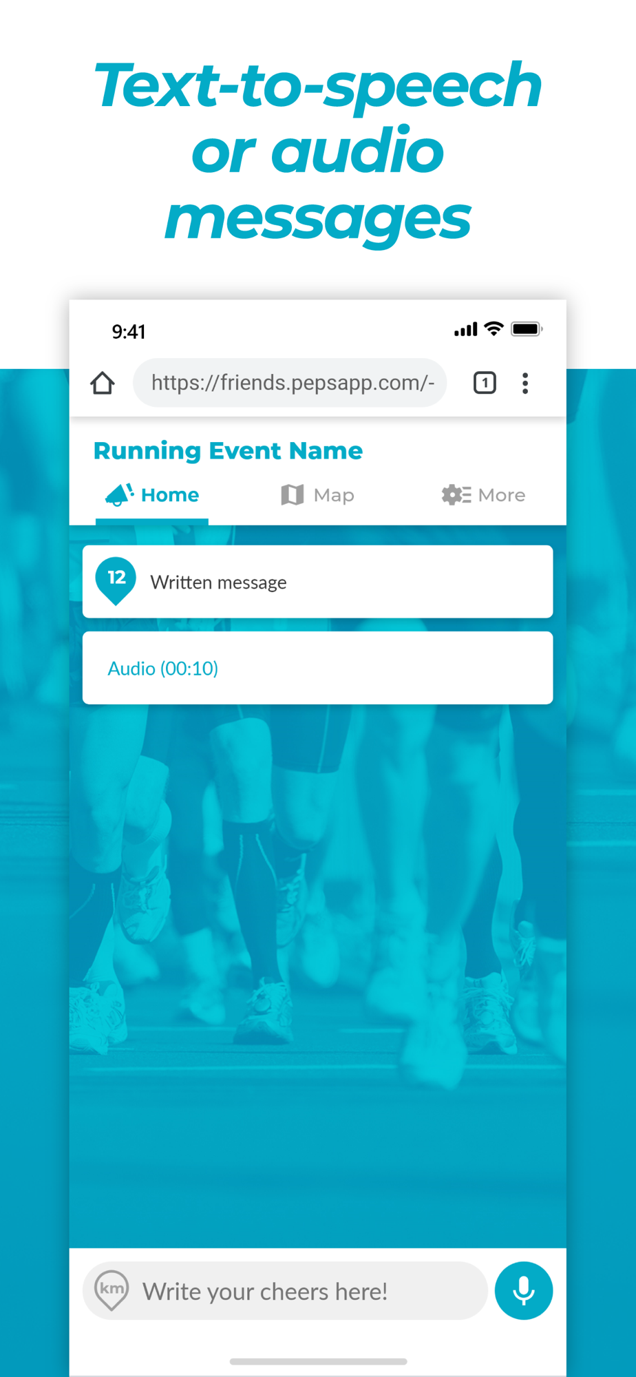 With Peps, your friends and family can send you their own custom written or recorded cheers, which you will hear on the race course while running the race. Friends can either send their cheers in advance prior the race, or send them LIVE while watching your strugg..enjoyable voyage towards the finish line.
