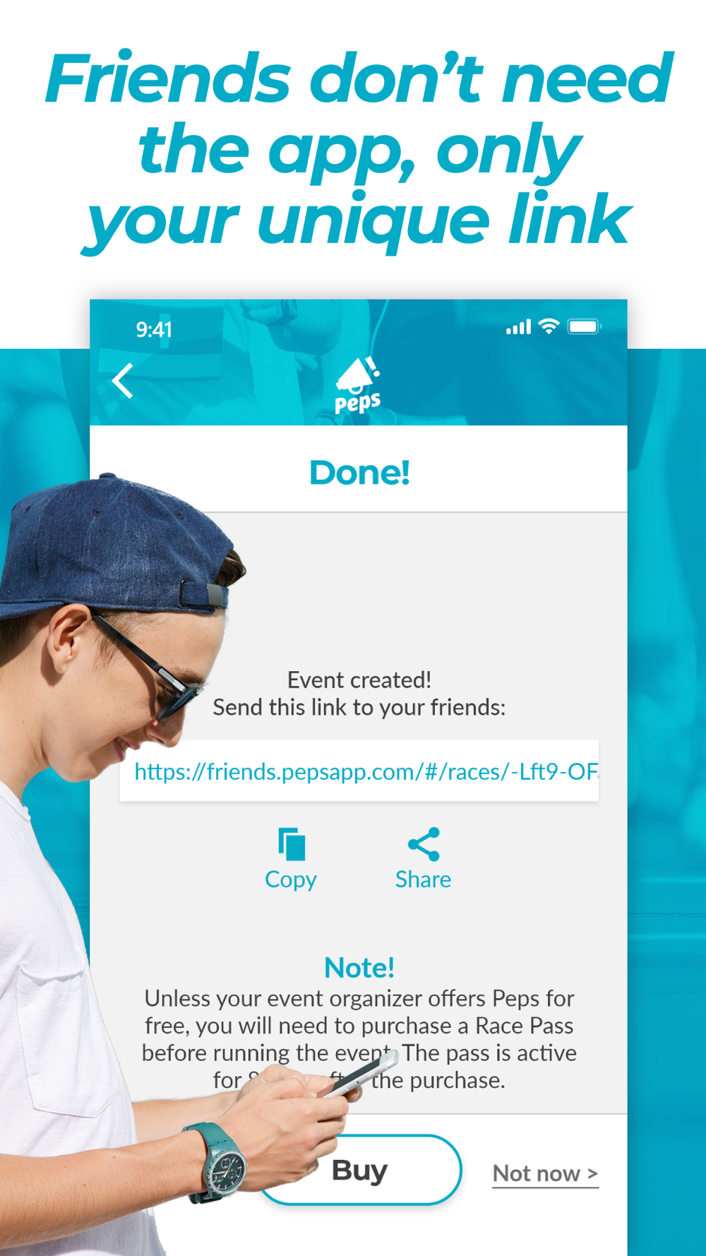 Your friends do not need the Peps app and they don’t need to register anywhere either. You simply create your race event’s unique magic link in the Peps app and then just send the created link to your friends. Friends will do all their things on that web page. Friends will not see other friends´ messages and so can’t you until the race is over. So it will be a lot of fun!