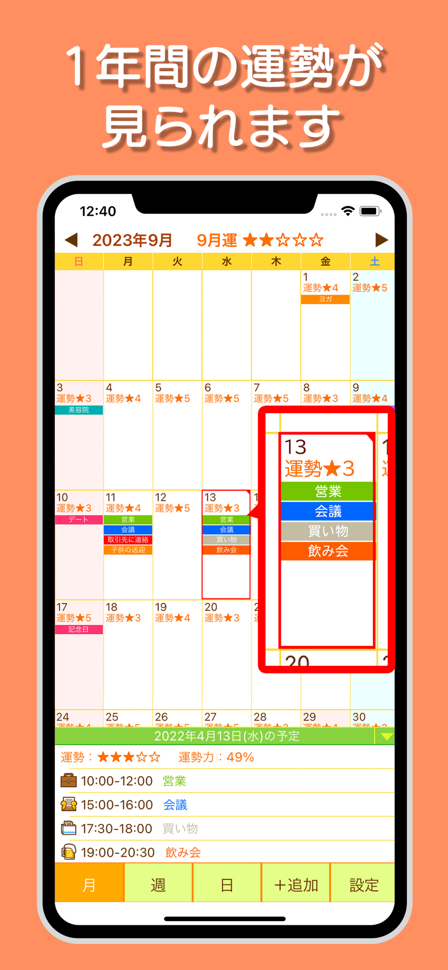 気になる月、日の運勢を5段階表記と、日の運勢を数値で表した「運勢力」を確認することができます。
