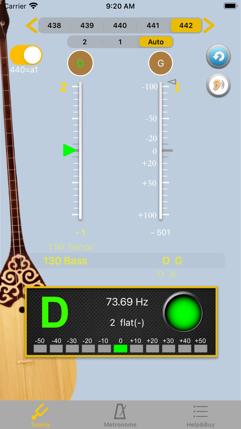 The simple user interface with noise filtering can help you tuning the 2 strings with simple setting while activating the APP. First step is choose the frequency at top of screen, then choose the tuning at the middle of the screen. When you pull the Dombra string, the pitch will be shown on the panel for the individual string by indicating signal high or low.