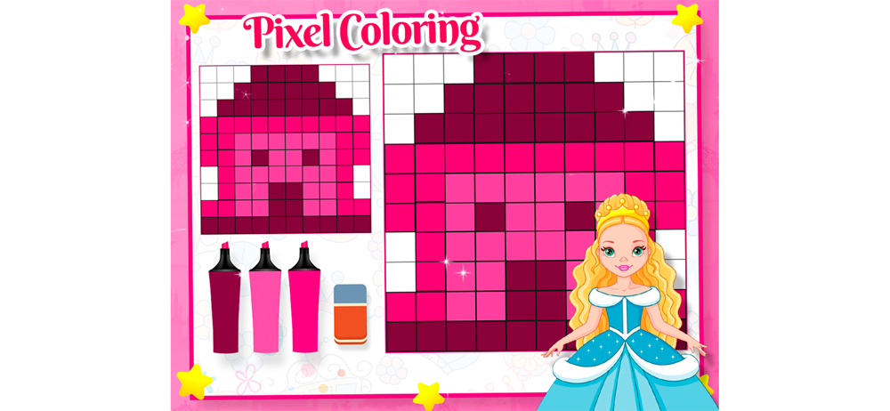 Pixel colouring or Mosaic Puzzles help to relax while drawing. This is an effective approach to visual perception while having fun colouring. It has cute princess colouring mosaic puzzles. Mosaic puzzles are an excellent fun break, as it improves Judgement logic, visual memory, cleverness, and imagination. Also, it develops concentration skills.