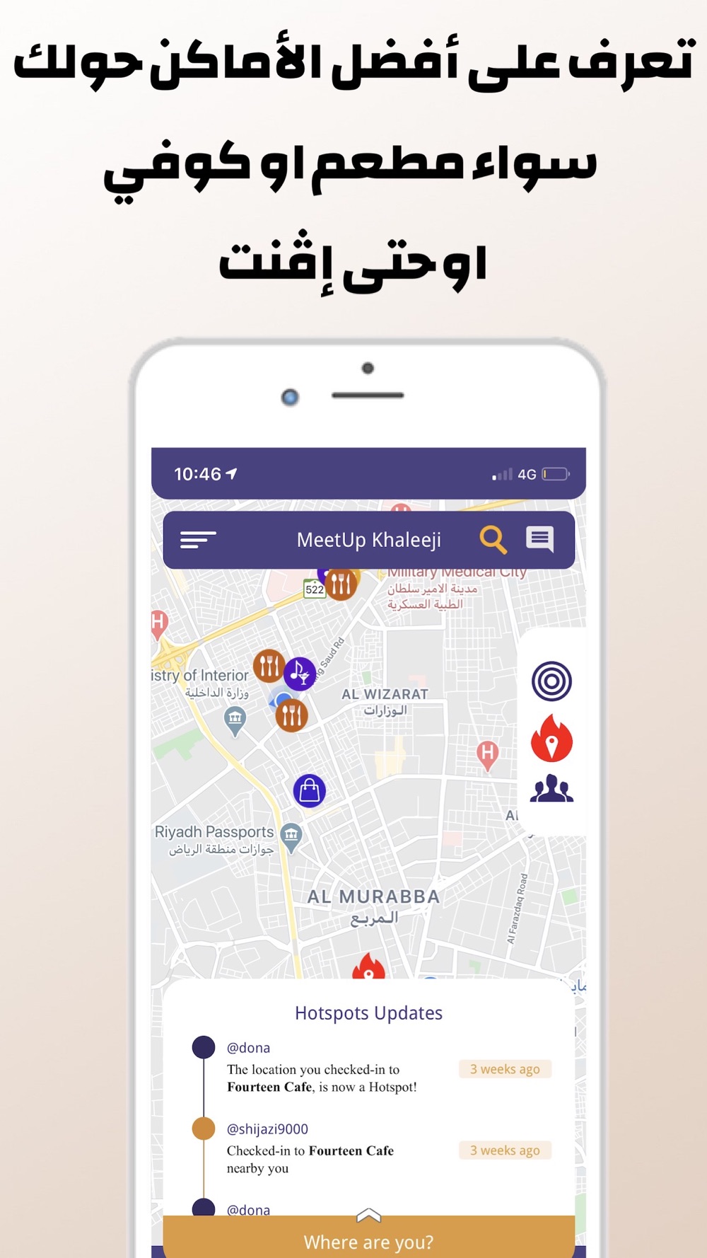 Want to meet a Khaleeji in person? Check Hotspot and you can see where Khaleejis hang out. Our “who’s there” feature showcases who is exactly in a specific place and you can chat within the app prior to getting to the specific Hotspot.