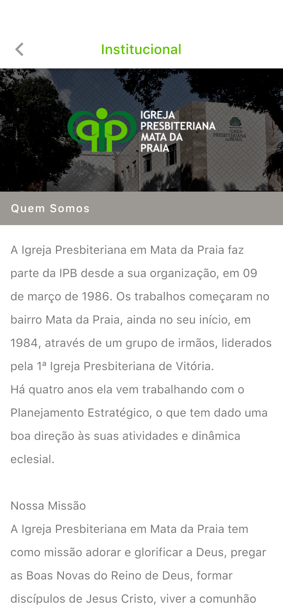 Seja muito bem-vindo ao ao aplicativo da IPB da Mata (Igreja Presbiteriana Mata da Praia). Aqui você pode conhecer mais sobre nossa comunidade, suas programações, boletins, notícias, estudos etc.
