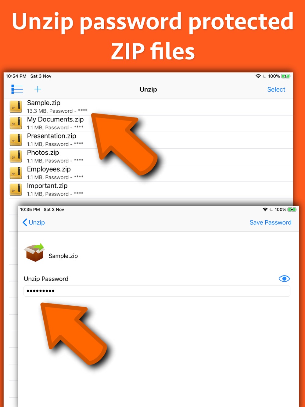 ZIP, Unzip and password protect ZIP files. Share ZIP files from any application like an email client to Unzip it using the application. The application could also Unzip password protected ZIP files. It also has its own previewer & files browser using which all Unzipped files could be viewed, shared, Saved and opened inside the application directly.
