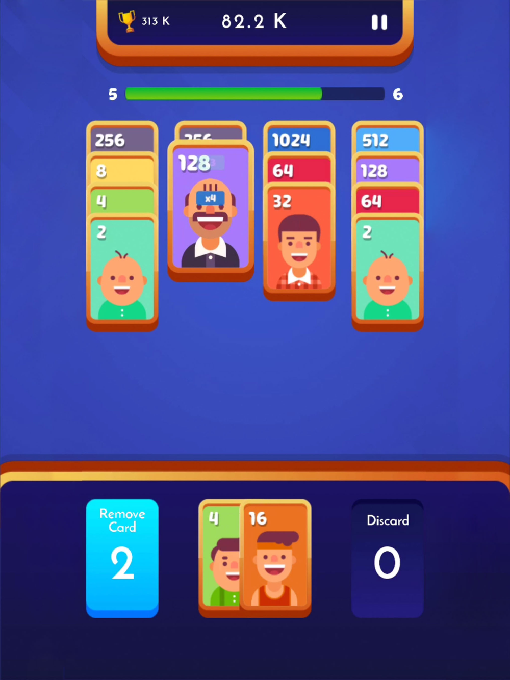 Swipe the cards to merge the faces. When two same faces with the same number touch, they merge into one.