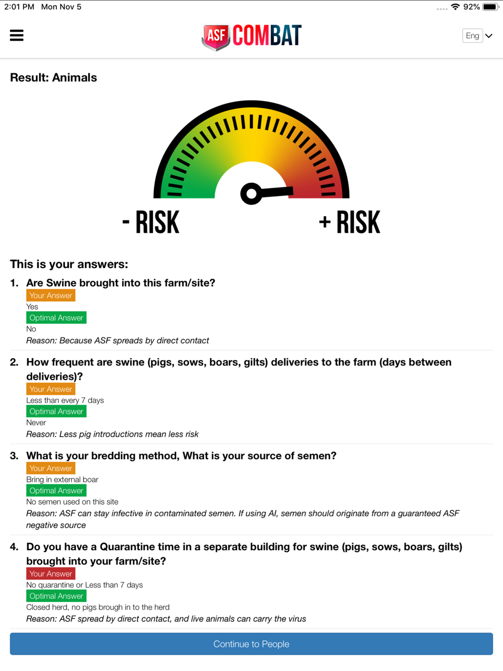 A set of questions based on the known biosecurity risks for ASF provides an indicative risk score and gives you optimal solutions to build and maintain the highest possible biosecurity around your farm, so you have the best odds to prevent African Swine Fever.