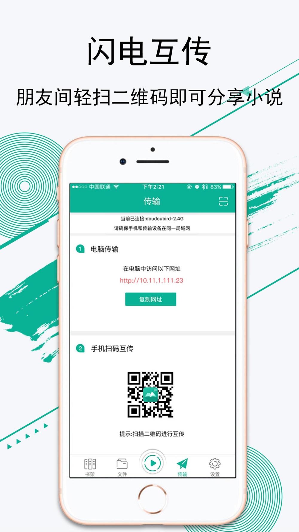 【文件互传】支持手机与手机间的无线传输,朋友间扫描二维码,即可轻松完成书籍、小说、有声读物的分享。同时,支持电脑与手机间的无线传输,打开电脑浏览器,选中目标文件,点击发送即可。