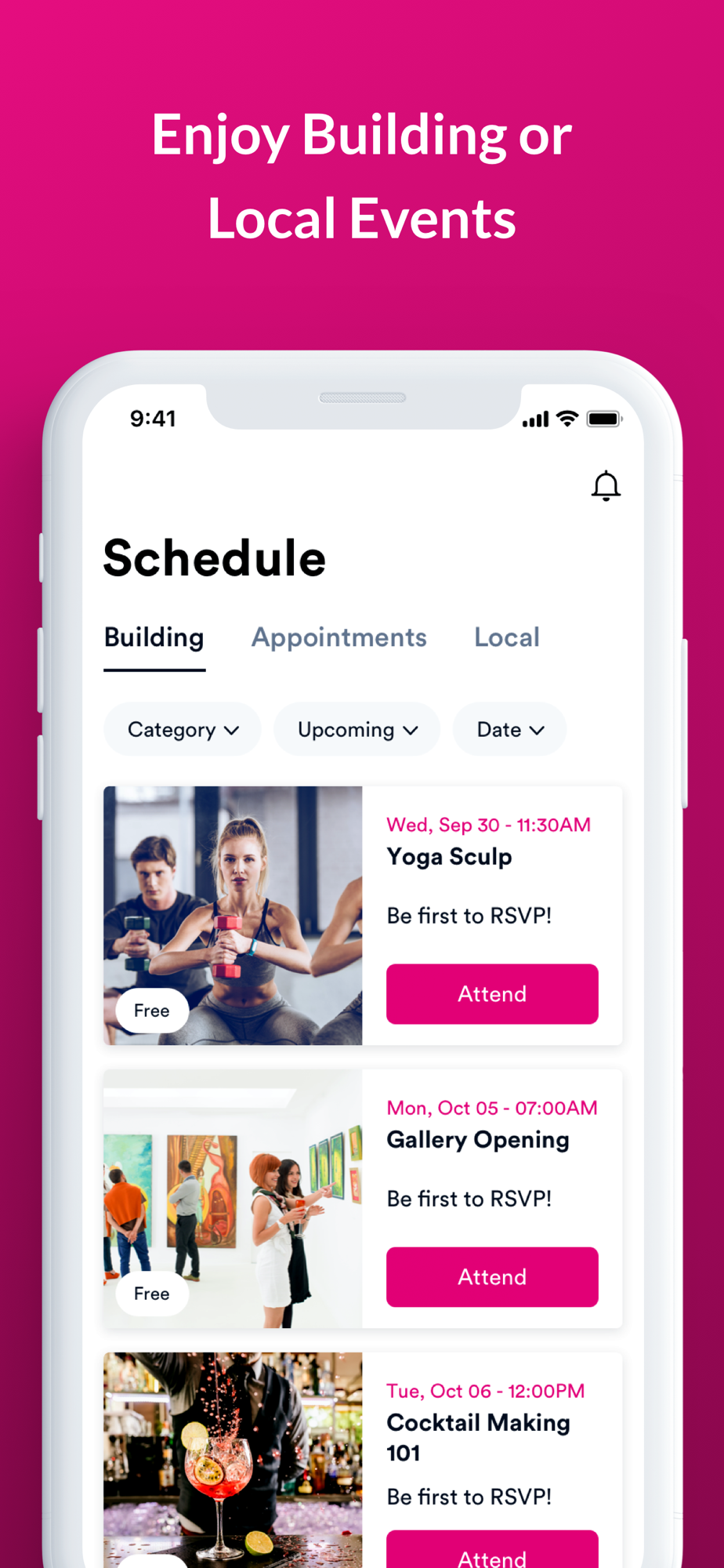 Our app has everything you need in the palm of your hands. From RSVPing for upcoming events in the building to paying rent, requesting maintenance or booking service amenities in seconds, our app lets you live a life of ultimate convenience.