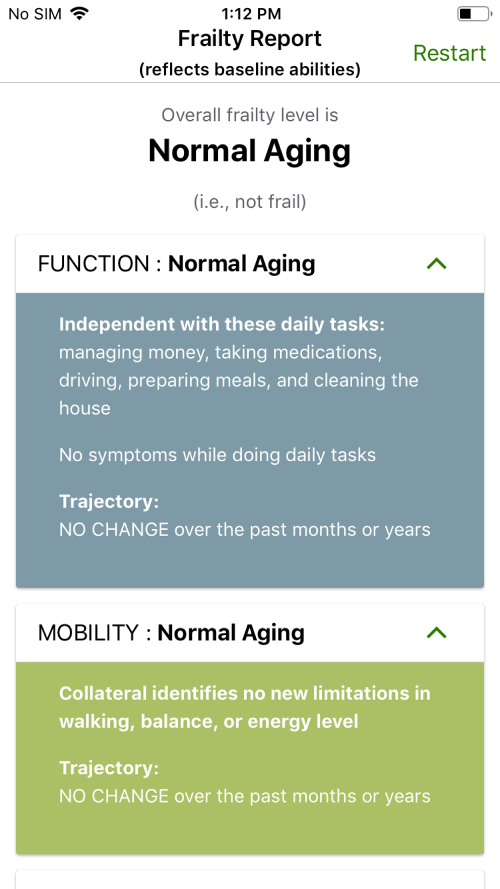 • Creates standardized, printable summary of frailty domains (a mini Comprehensive Geriatric Assessment) including cognition, mobility, and function