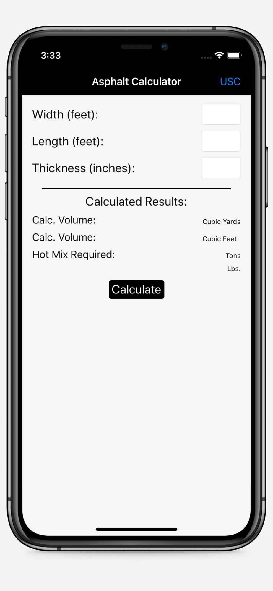 Asphalt Calculator app will calculate the number of cubic yards needed for a given job. It will also calculate hot mix tonnage.
