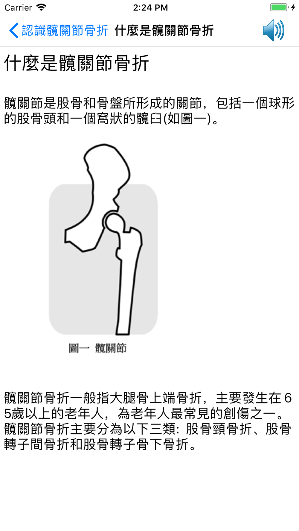This app provides information about hip fracture care including "Understanding Hip Fracture", " Hip Fracture Care", "Training" and "Companion". In addition, physiotherapists can set notification for training program and the app will send alerts to prompt users to start the training in accordance with the setting. Patients can then complete the training and save the record in the app. Physiotherapists can monitor patient training status in the app.