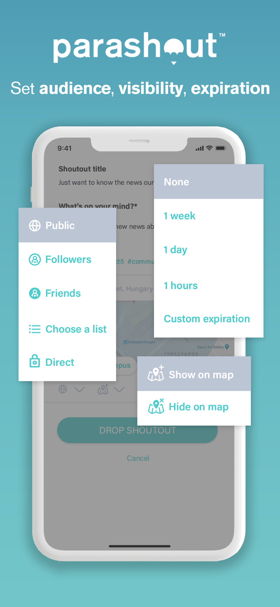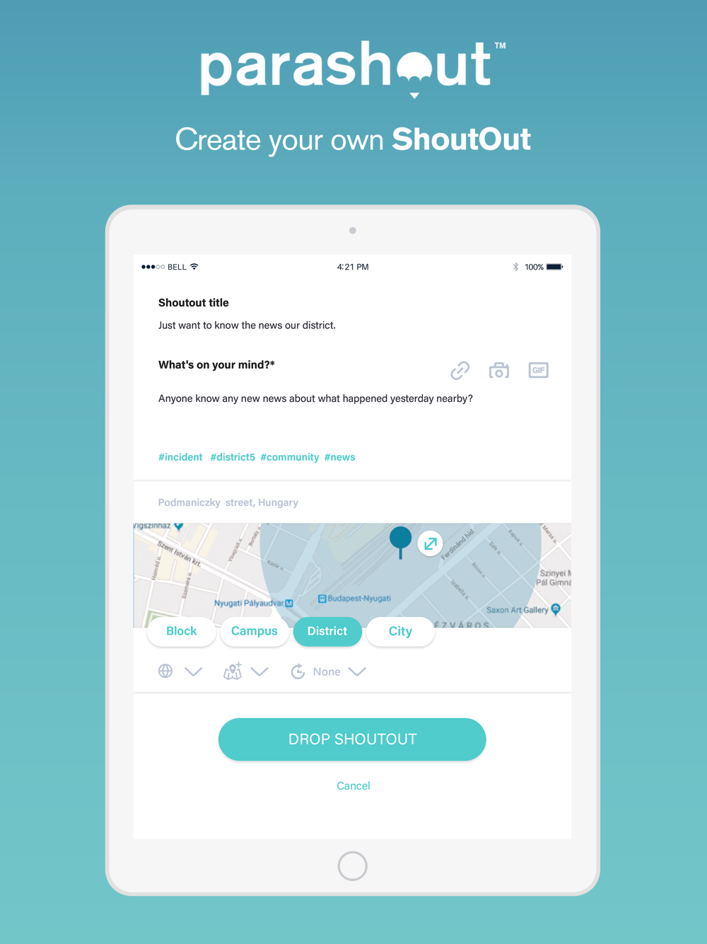 Parashout is the best location based marketing tool if you want to improve your company. If you want to explore and target some people or community you can use the list function (audience settings) for your ShoutOut. We have some great filter for your post, where you can set the relevant audience, drop the post on map, or set the radius size to block, campus, district, city size. This also increases local engagement.