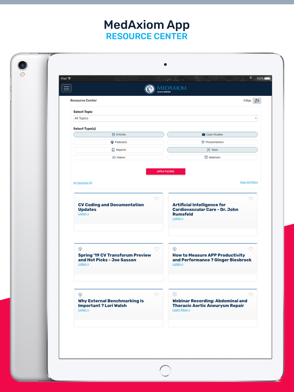 The power of many--that's the benefit of membership in the MedAxiom community. MedAxiom members are connected to the cardiovascular industry's most comprehensive and powerful network, sharing information and knowledge about important decisions health care organizations face every day. From program development to operational and coding issues and everything in between, MedAxiom members have a platform to optimize practice resources and dramatically improve both business and patient-care outcomes. Anchored by comprehensive, best-in-class operational and financial data, the network is designed to serve all levels of staff from c-suite leaders and administrators to coding and billing staff.