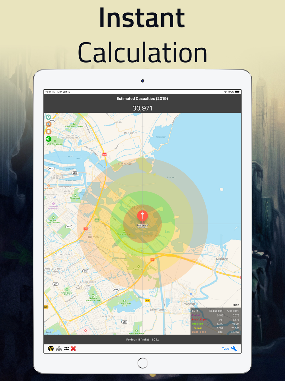 This app can be used to experiment with the range of thermal radiation, the radius of radioactive fallout and the possible number of casualties. It includes a list of popular nuclear weapons in human history such as Little Boy, Fat Man and Tsar Bomba.