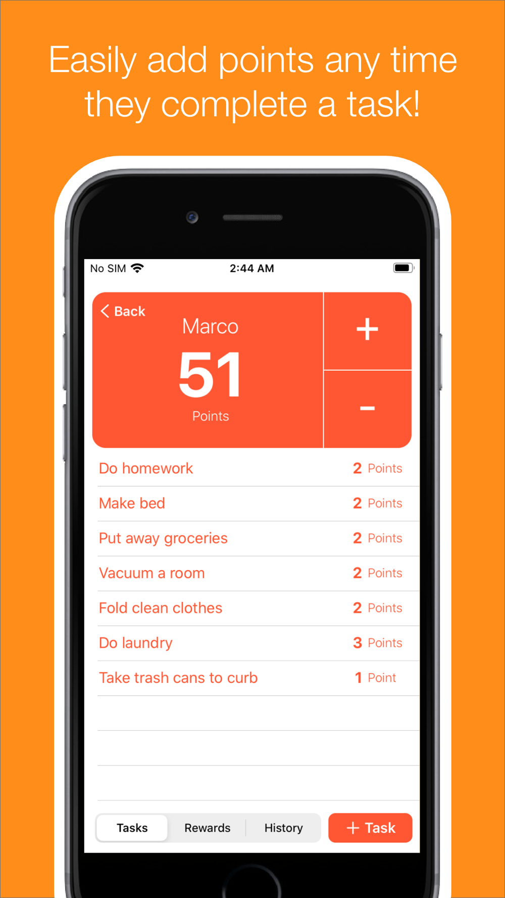 - Add task to each kid and give them points every time they complete one of their assigned tasks.