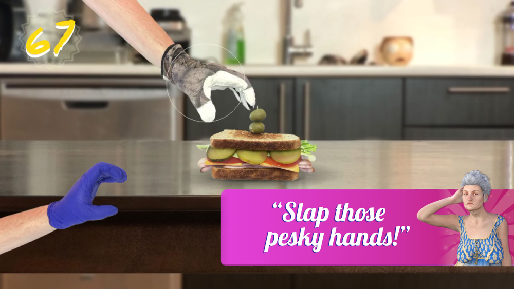 Grandma's Sandwich is a fast paced addicting high score style game that pits you against your nosy neighbor that's trying to steal one of your grandma's world renown sandwiches from right under your nose! Well not on your watch. Tap to slap away the protective gloves, then swipe the hand away before they take that godlike creation your grandmother made for you. Be careful, the longer you survive the stronger your neighbor's determination and gloves become!