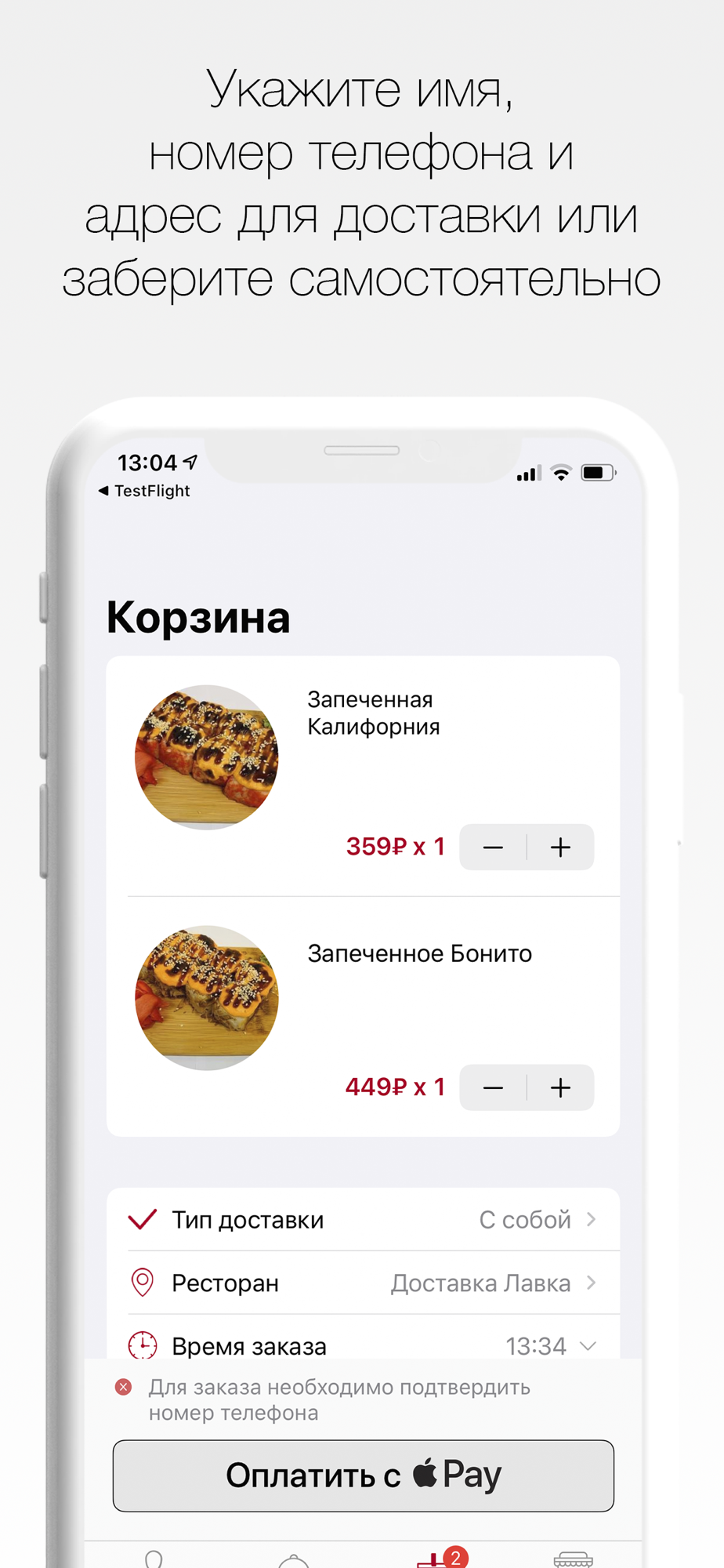 На экране заказа добавьте свою контактную информацию для первого заказа: Имя, Номер телефона и адрес электронной почты, чтобы получать уведомления об оплате.