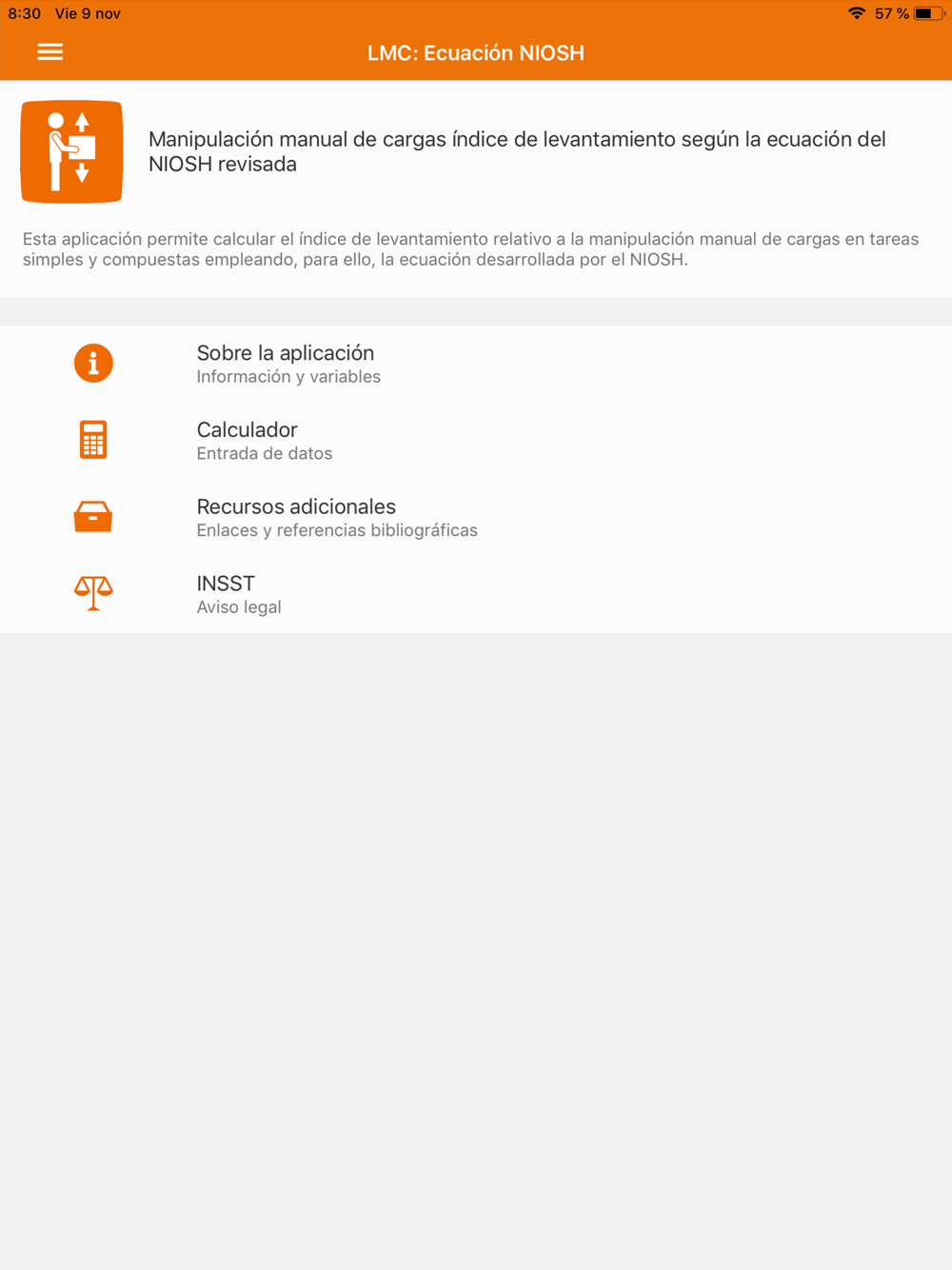 Esta aplicación permite calcular el índice de riesgo asociado a las tareas de levantamiento de cargas, tanto simples como compuestas, en base a la ecuación desarrollada por el NIOSH tal y como está recogido en la Nota Técnica de Prevención 477.