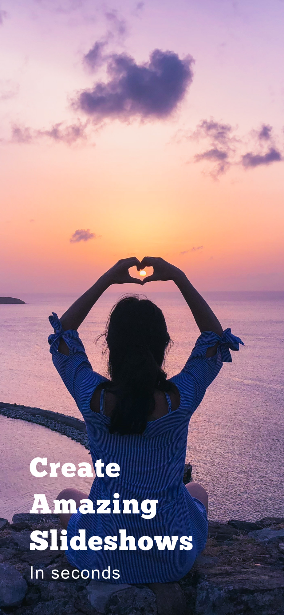 Filter each image, add special effects, text, emojis and more! Easily select images from your photo library, add music and special effects, edit slideshow length and share directly to social media or the camera roll!
