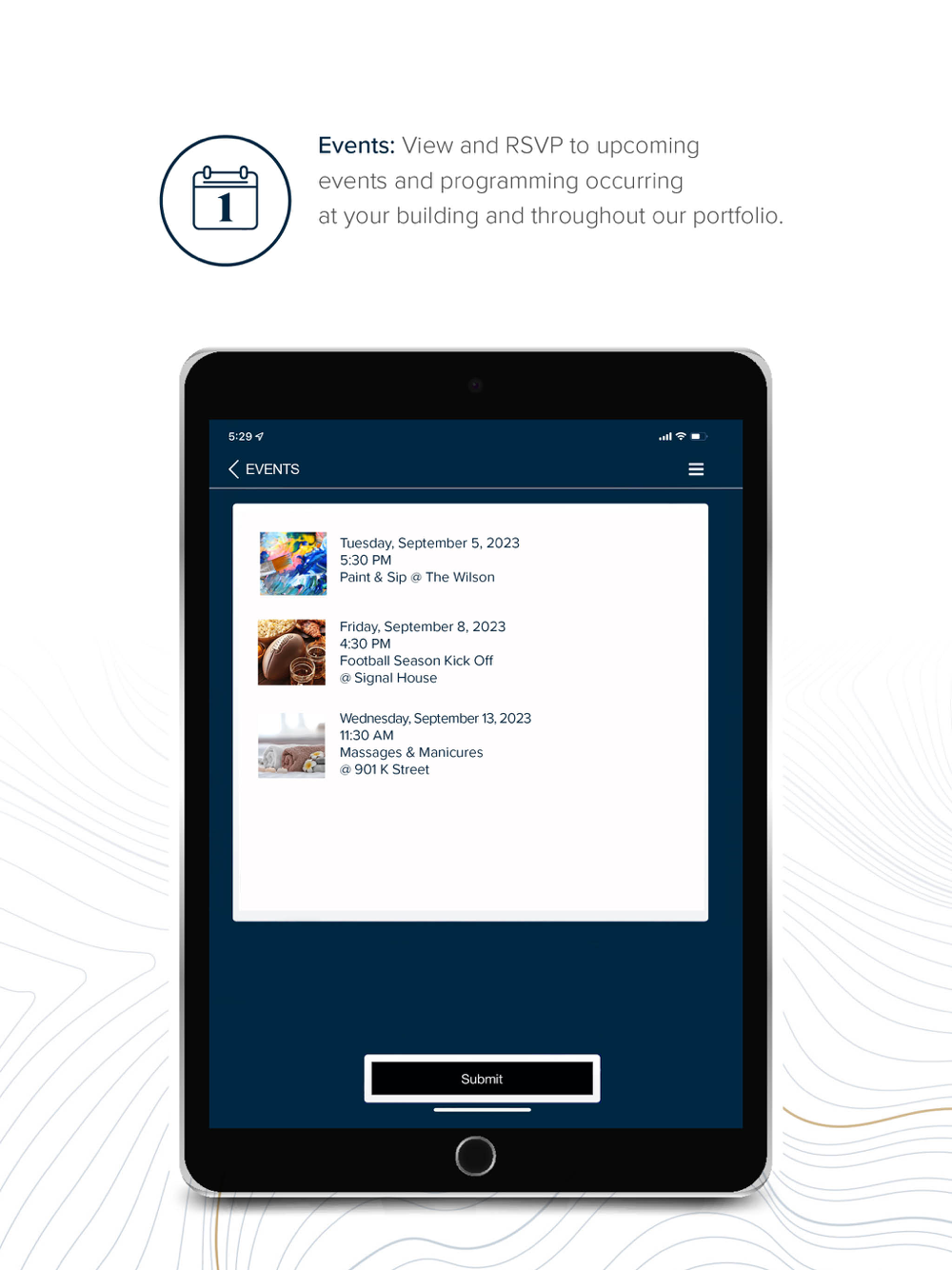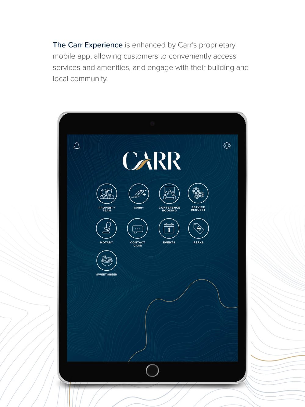 The Carr Experience is enhanced by Carr’s proprietary mobile app, allowing building customers to conveniently access services and amenities, and stay connected with their property team and building programming.