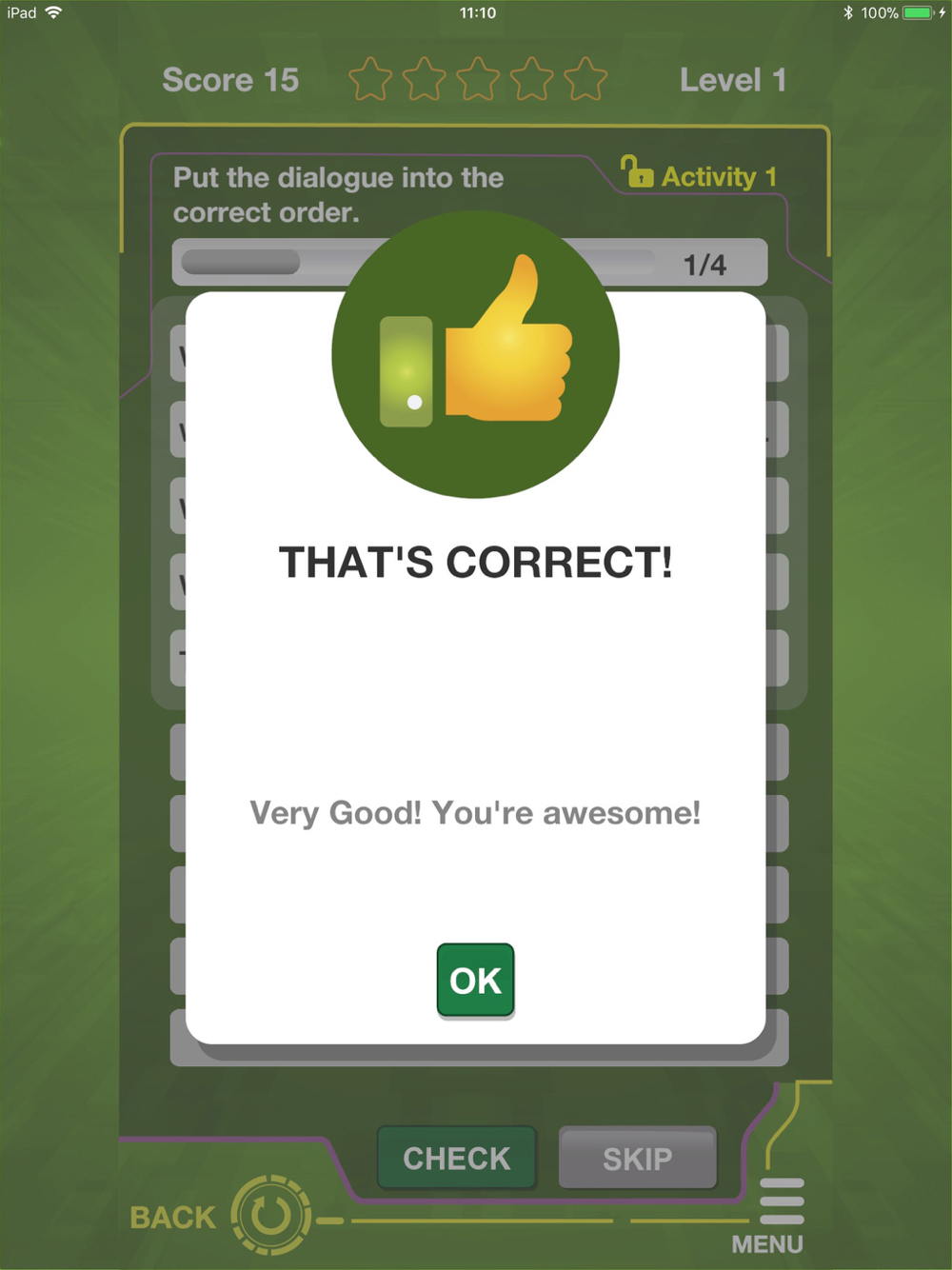 App com atividades extras para todas as unidades, para prática complementar fora da sala de aula em forma de jogo.