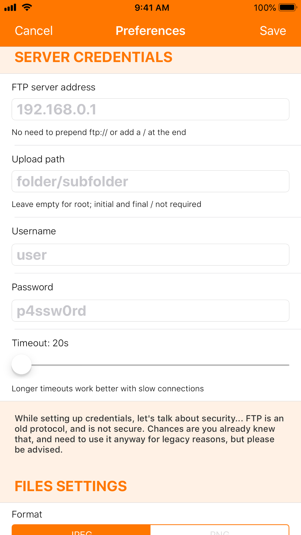 Please be advised that the usefulness of this app is directly connected to the availability of a custom FTP server (sFTP not supported); you don't need a permanent connection to this server in order to use the app (for instance, you can take photos offline while on the move and only upload them when you are connected to your company's network) but if you or your company do not have a dedicated server available to use as destination for the upload, PhotosUpload will be able to provide you little value.