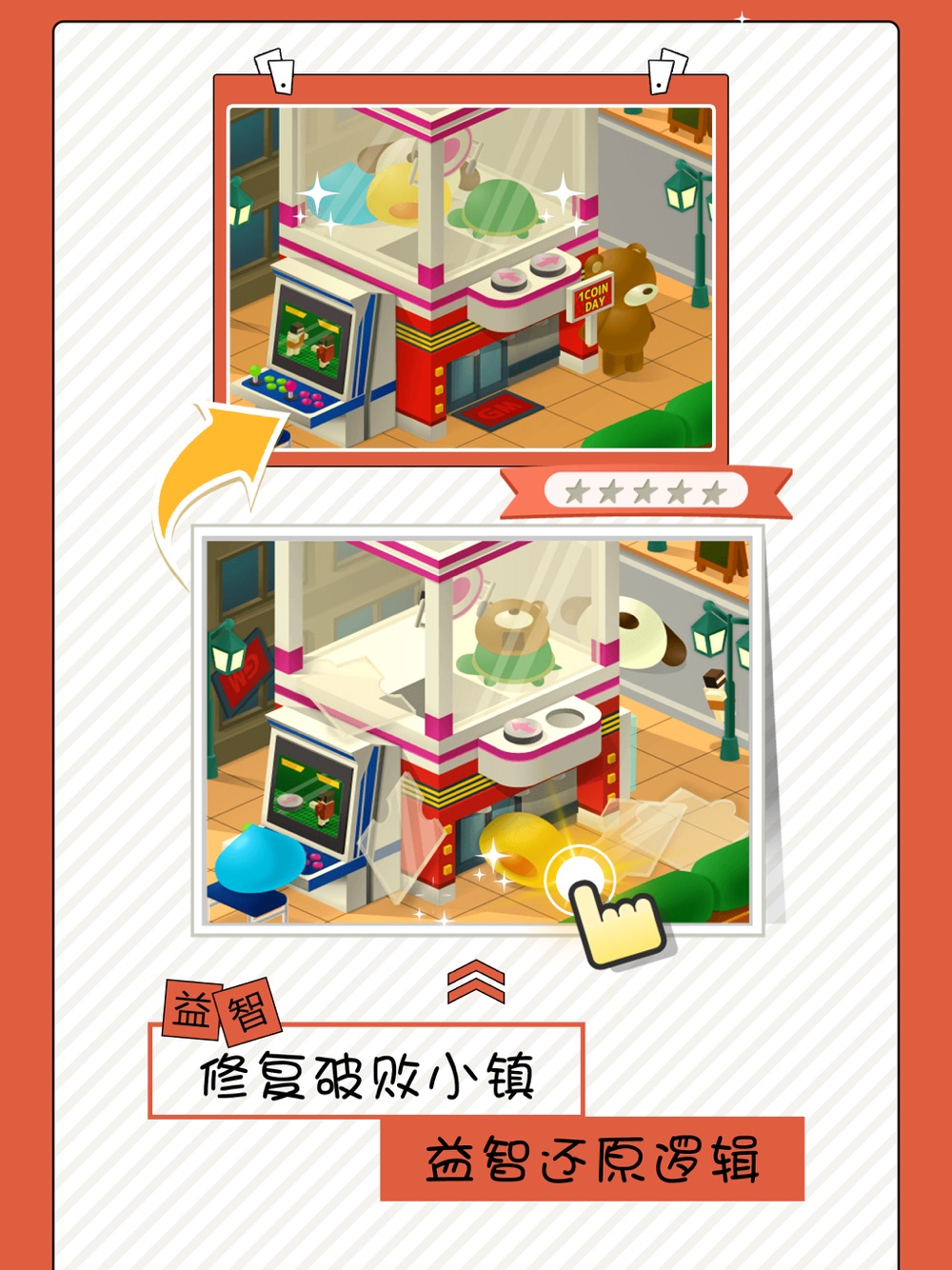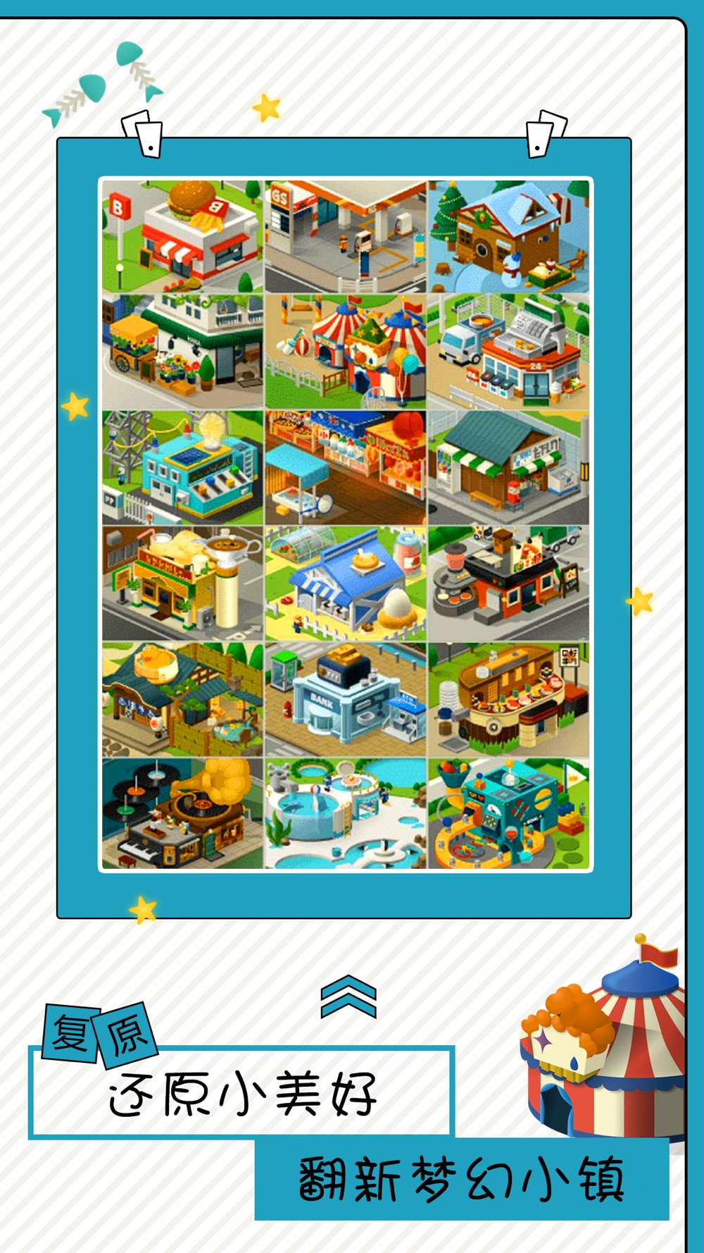 在Q趣的神奇小镇中,依靠点击修复被破坏的地方。然而仅仅点击是不够的。要善于地发现小镇中的逻辑,借助运行的规律巧妙地完成修复。