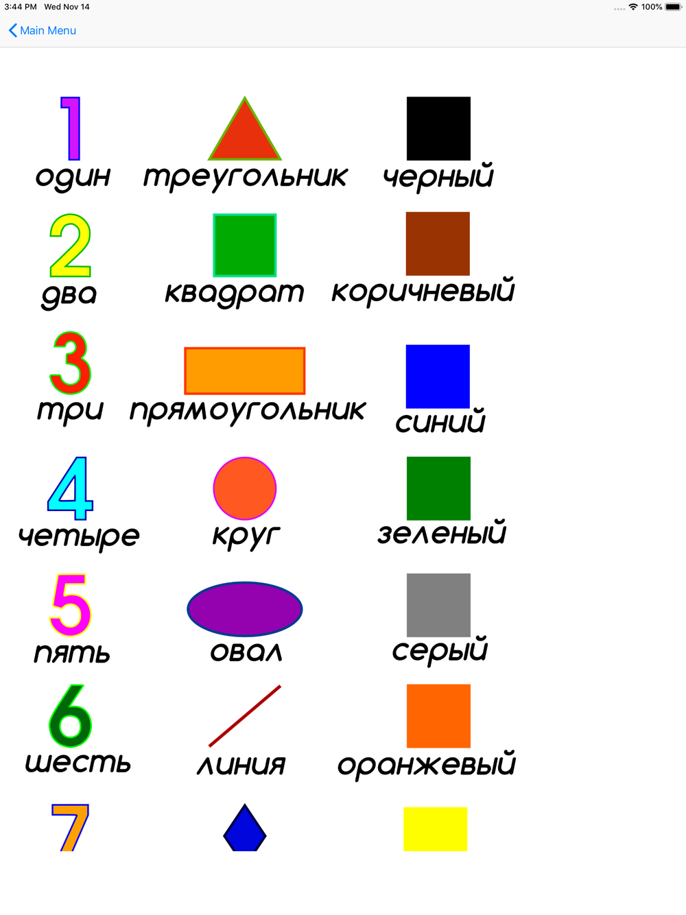 This app offers you the opportunity to learn numbers, shapes and colors in Russian.