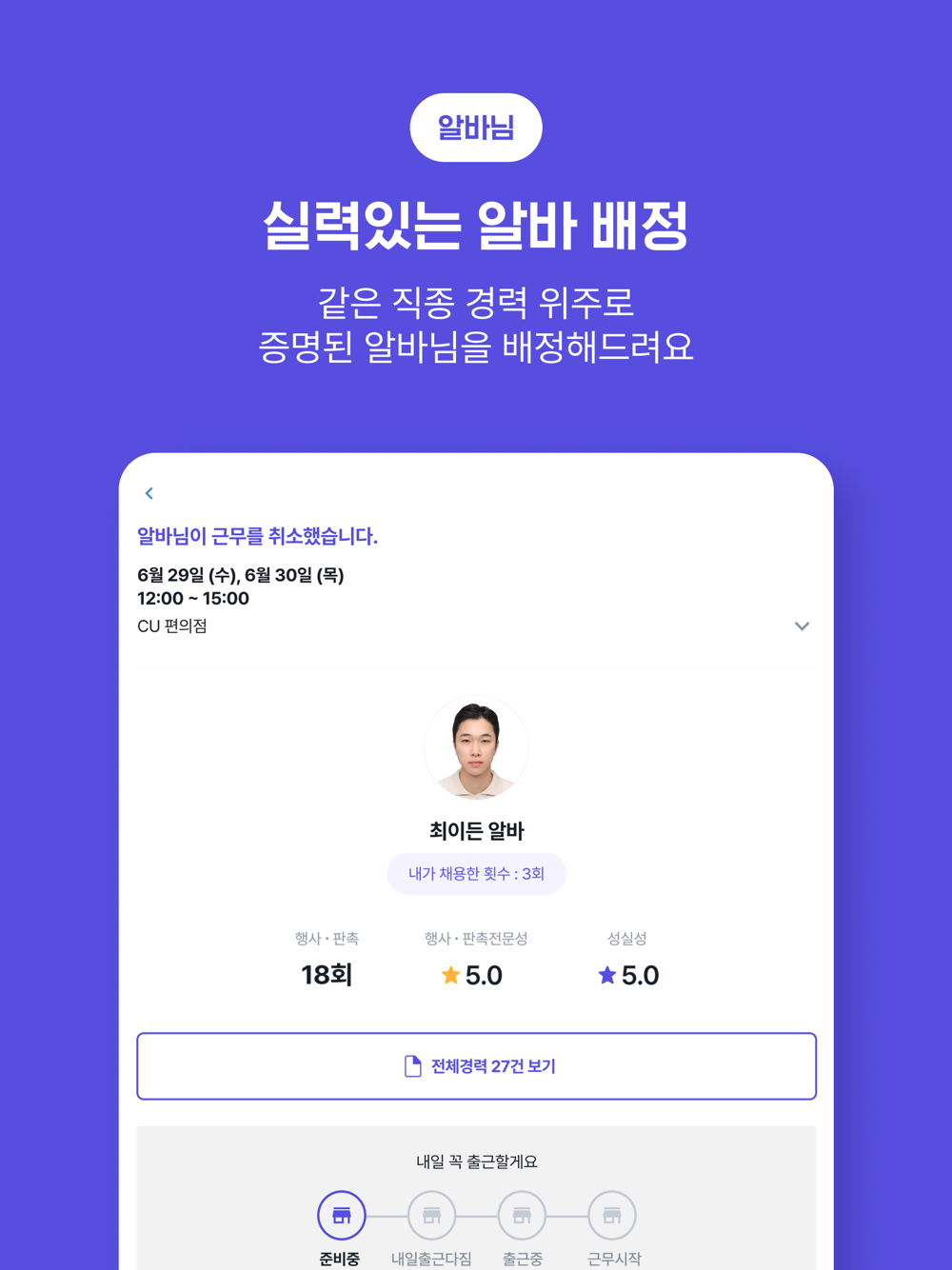 • 배정 후에도 알바님에게 확인연락을 하여 무단결근을 방지합니다