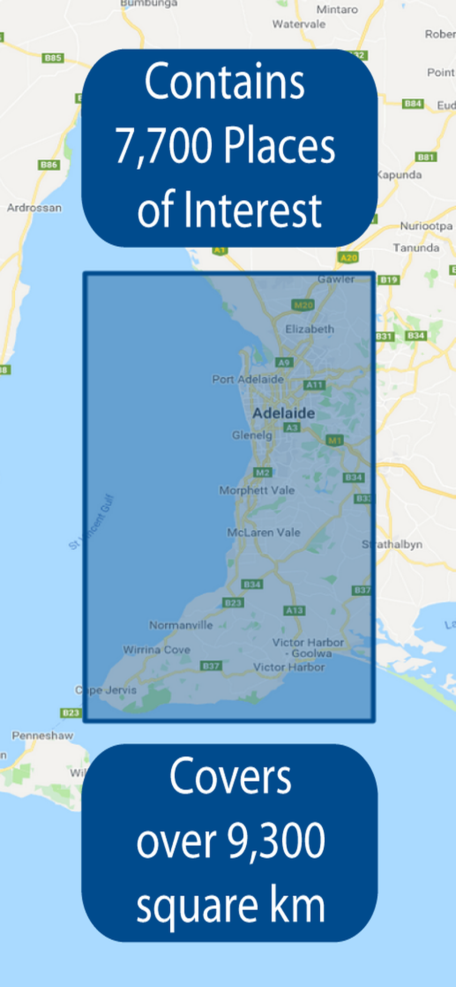 This version for Adelaide,South Australia, locates places around the city and surrounding areas, extending northwards to Gawler and south Cape Jervis. This is an area of over 3,600 sq miles (9,300 km2).