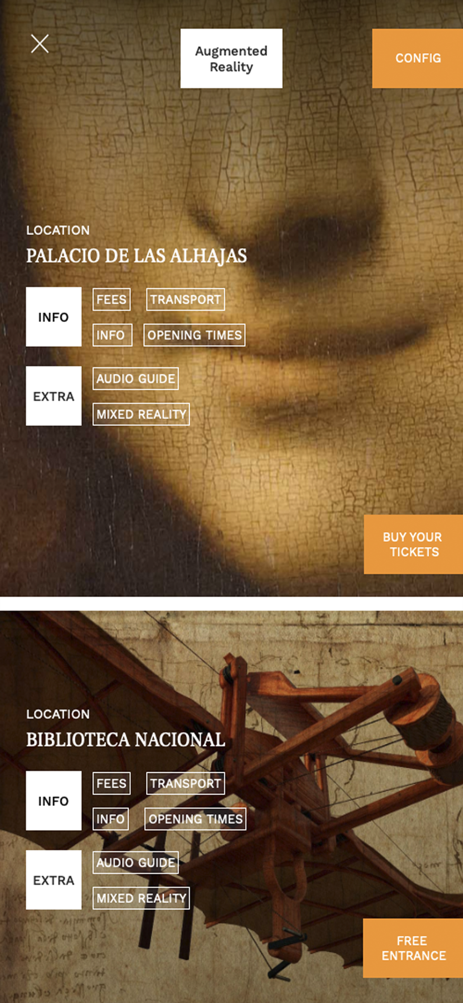Users of the exhibition’s official app will be able to access a free audio tour to guide them through the exhibits, view practical information on the show’s two venues (Palacio de las Alhajas and the Biblioteca Nacional de España) and book tickets. They will also be able to admire some of Leonardo’s inventions as never before where and when they want thanks to a spectacular use of mixed and augmented reality.