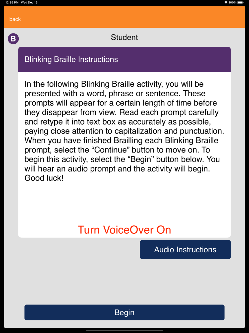 The main goal of Writing Adventure Time is to create and disseminate a mobile app that incorporates evidence-based instructional strategies to support the development of literacy skills of students who read braille. A secondary goal is to increase the technology skills of students and teachers who use the app. Specifically, to access the app, teachers and students must learn to use iPads with Voice Over (VO – a screen reading accessibility option built into the operating system for individuals with visual impairments) and refreshable braille displays (a portable peripheral device that pairs with the iPad and provides a braille output of the screen).