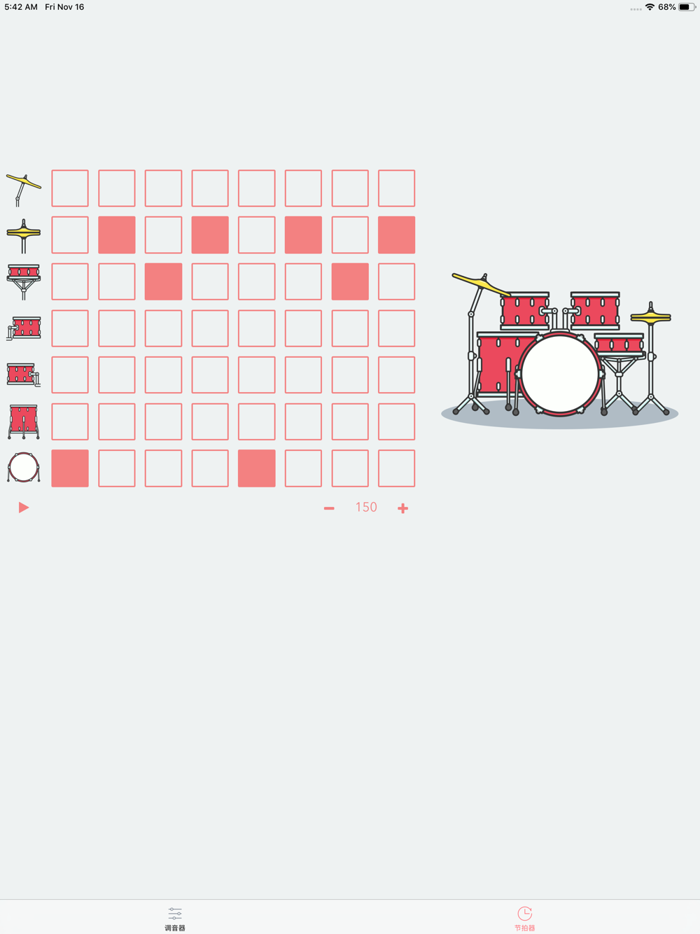 节拍器采用了7种架子鼓音效,可进行自由组合,并调节速度,实现所需节拍的架子鼓演奏效果,一个人就是一支乐队。