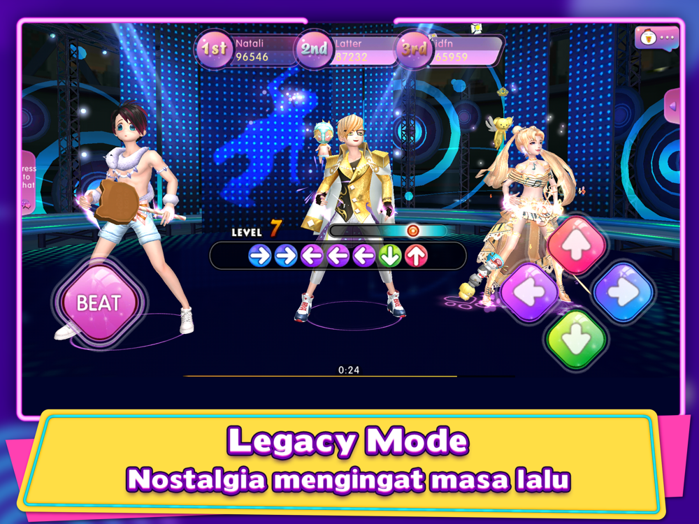 Mode Bermain: 2 Mode terkenal dari seluruh dance game yang pernah ada. Mode tradisional "LEGACY MODE" menggunakan arah panah, serta Mode modern "DYNAMIC MODE" gaya bubble yang sangat populer untuk show off skill kamu kepada teman-teman komunitas.